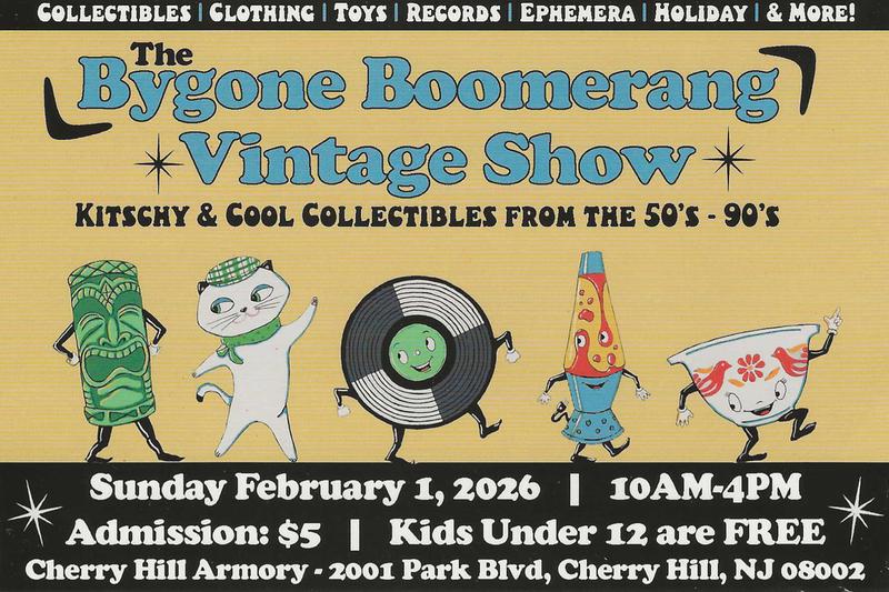 Join us for the first annual Bygone Boomerang Vintage Show on Sunday February 1, 2026 at the Cherry Hill Armory, right off of Rt 70 in Cherry Hill, NJ. Enjoy vintage vendors specializing in cool and kitschy objects from the 1950's-1990's including, but not limited to, collectibles, ceramics, glassware, records, cassettes, clothing, jewelry, toys, advertising, ephemera, holiday, blow molds, barware, tiki, Pyrex, mid-century modern, decorative items, art, kitsch, and so much more! Join us from 10AM-4PM for general admission. Admission is $5 and kids under 12 are FREE! Learn more at our website for this show.