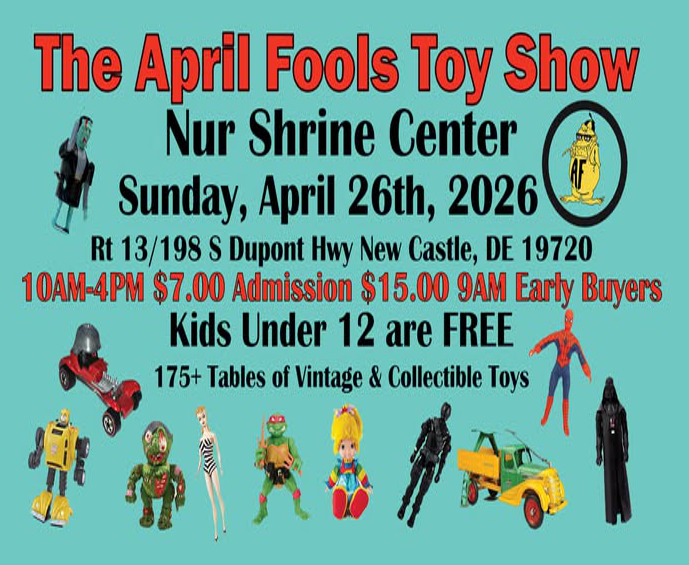 On Sunrday, April, 26th, 2026. A ToyShows.org & AL / WHO Event. We will be return with Delaware’s largest toy show the April Fools Toy Show, We have added what we call the Debut Room for new and last-minute vendors. 175+ tables of new, collectible, and antique toys. 10:00am to 4:00pm. Still a bargain admission is $7.00, children under the age of 12 are free, $15.00 Early Buyers 9:00am Admission. Collectors you do not want to miss this show, Free parking. Food Truck. A Rain or shine indoor events. The Nur Shrine Center is convenient to I-95, I-295 and US Route 40. 3 miles from the Del. Mem. Bridges. 20 minutes from Philly.